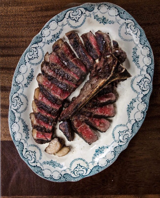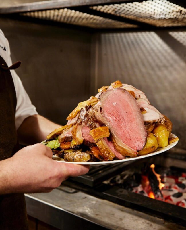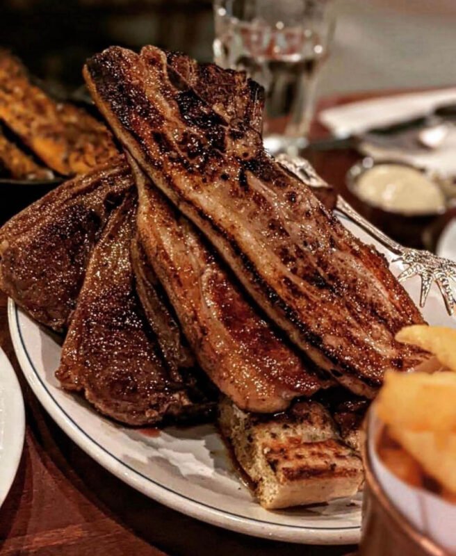 The menu at Blacklock features a range of meat options, including chops, steaks, and ribs, all cooked over the restaurant’s signature charcoal grill.