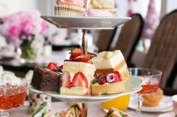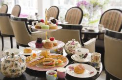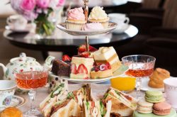 The afternoon tea is served on a three-tiered stand, and it includes a selection of sandwiches, scones with clotted cream and jam, and a variety of pastries and cakes.